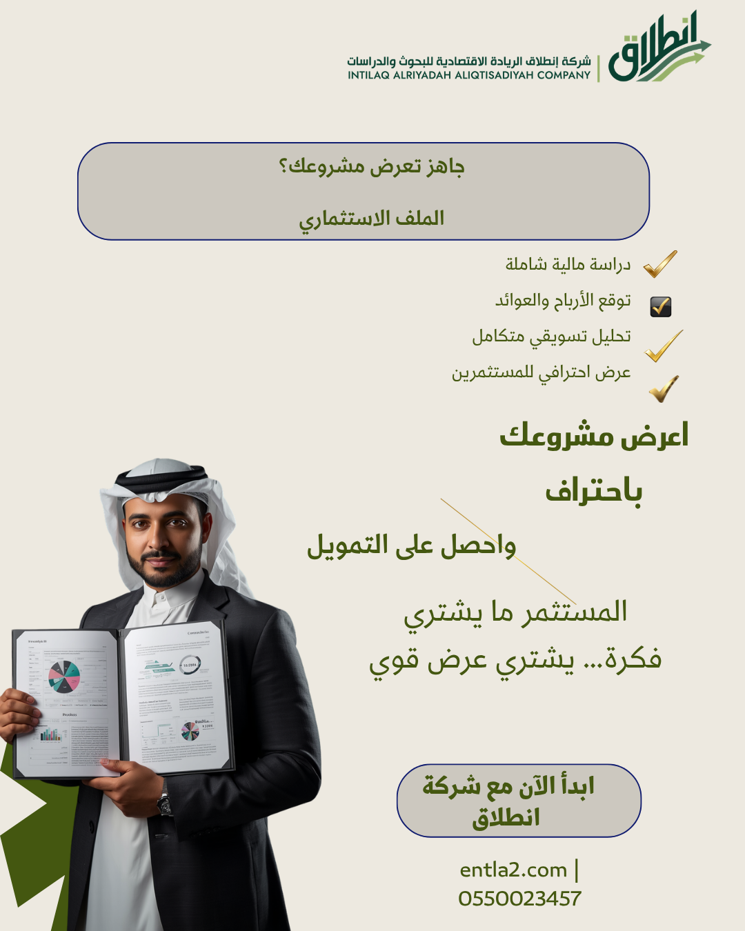📊 الملف الاستثماري 💼 هل تحتاج تعرض مشروعك بشكل احترافي للمستثمرين؟ في شركة انطلاق لدراسة الجدوى نصمّم لك ملف استثماري متكامل يعكس قوة مشروعك ويزيد فرص حصولك على التمويل. 💼 خدماتنا تشمل:...