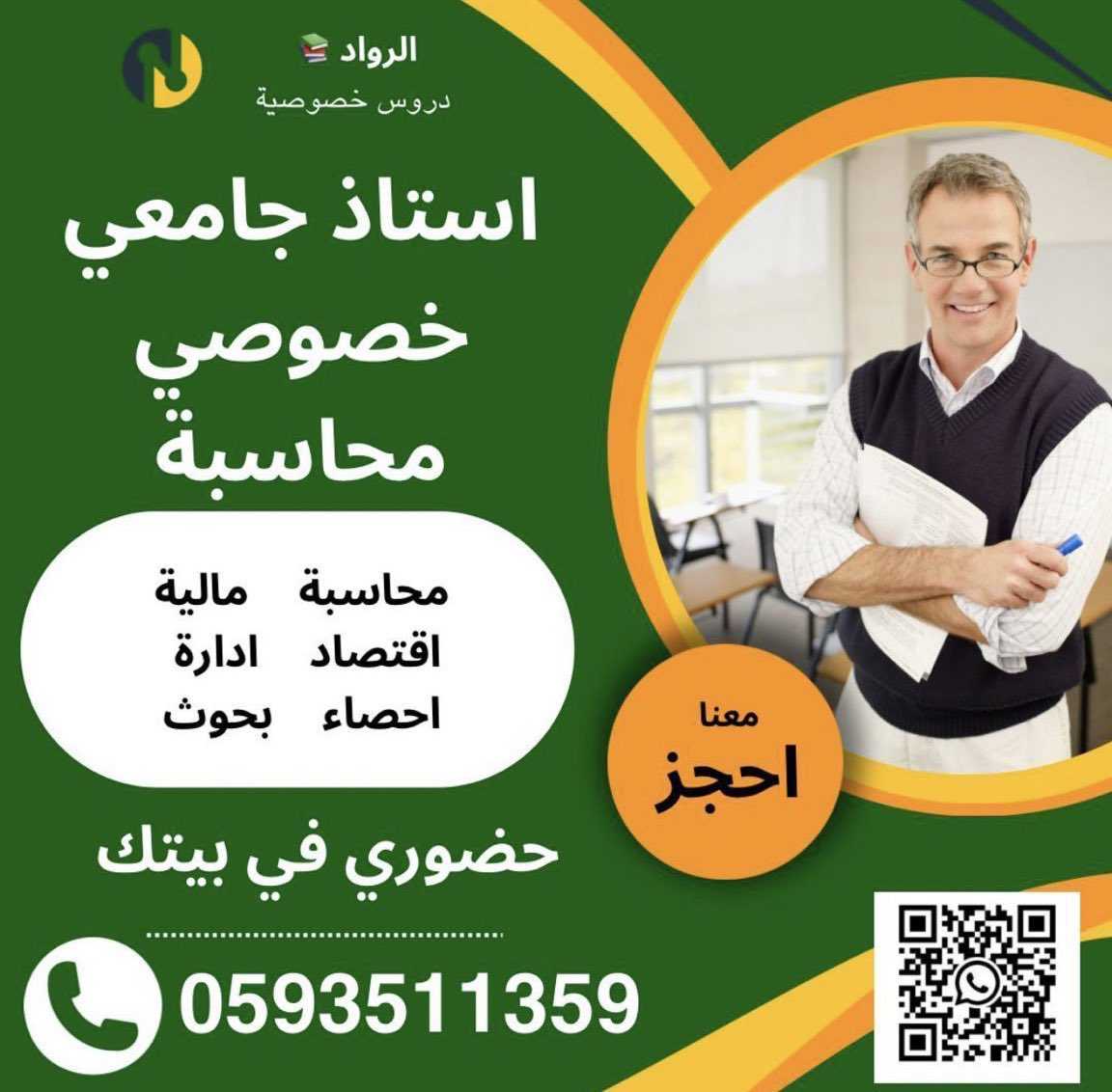 مدرس محاسبة جامعي خصوصي (محاسبة - اقتصاد - احصاء - ادارة مالية- بحوث) متابعة ومراجعة للاختبارات وضمان اعلى العلامات خبرة اكثر من 11 سنة السعر قابل للتفاوض للتواصل: 0593511359